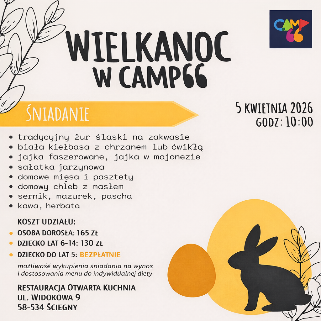 Restauracja CAMP 66 Tel. +48792566569,biuro@camp66.pl Restauracja otwarta w godzinach 9:00 – 21:00. Serwujemy śniadania, obiady i kolacje wegetariańskie, wegańskie, bezglutenowe i tradycyjne.Posiłki przygotowywane na miejscu, z produktów sezonowych.